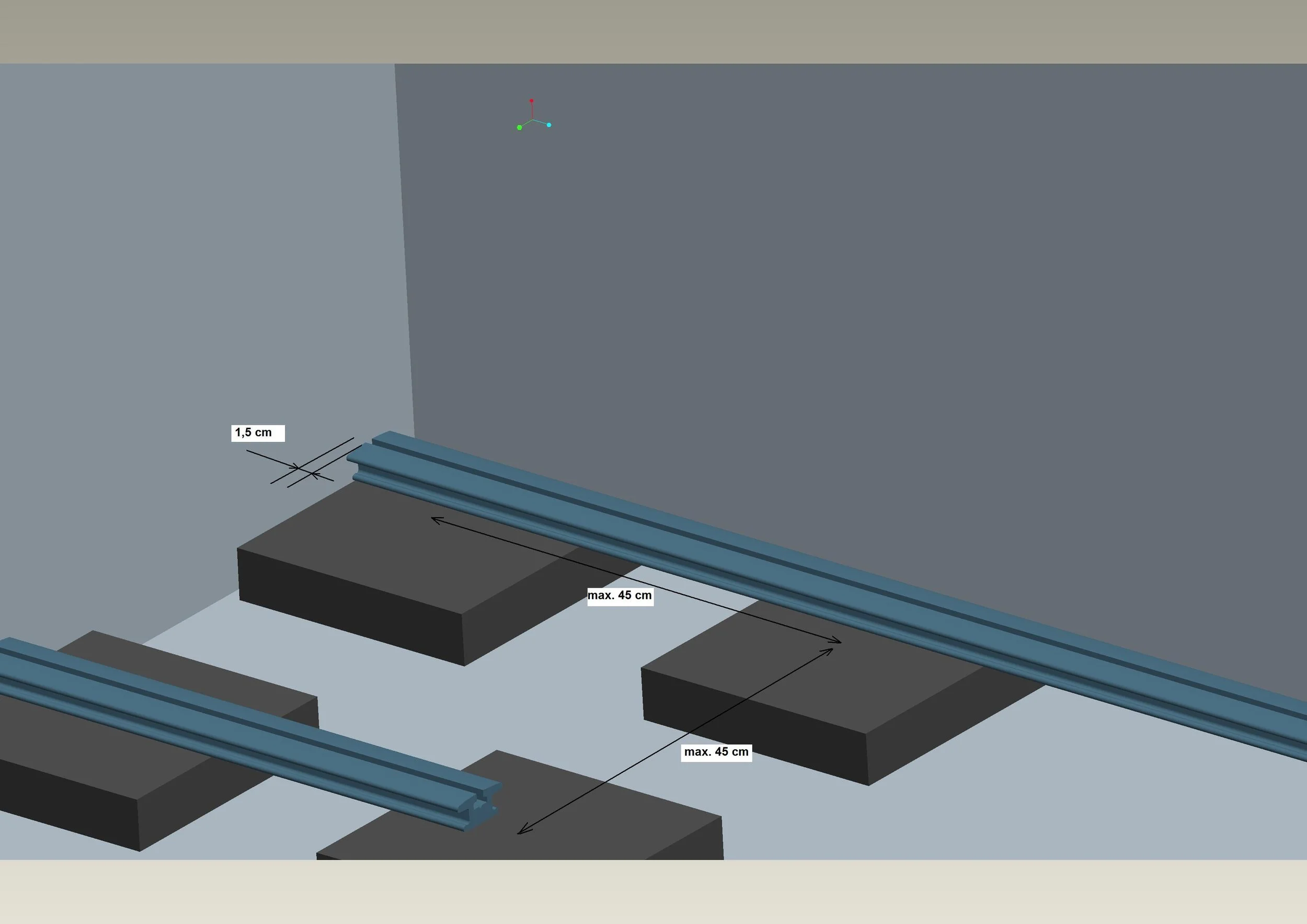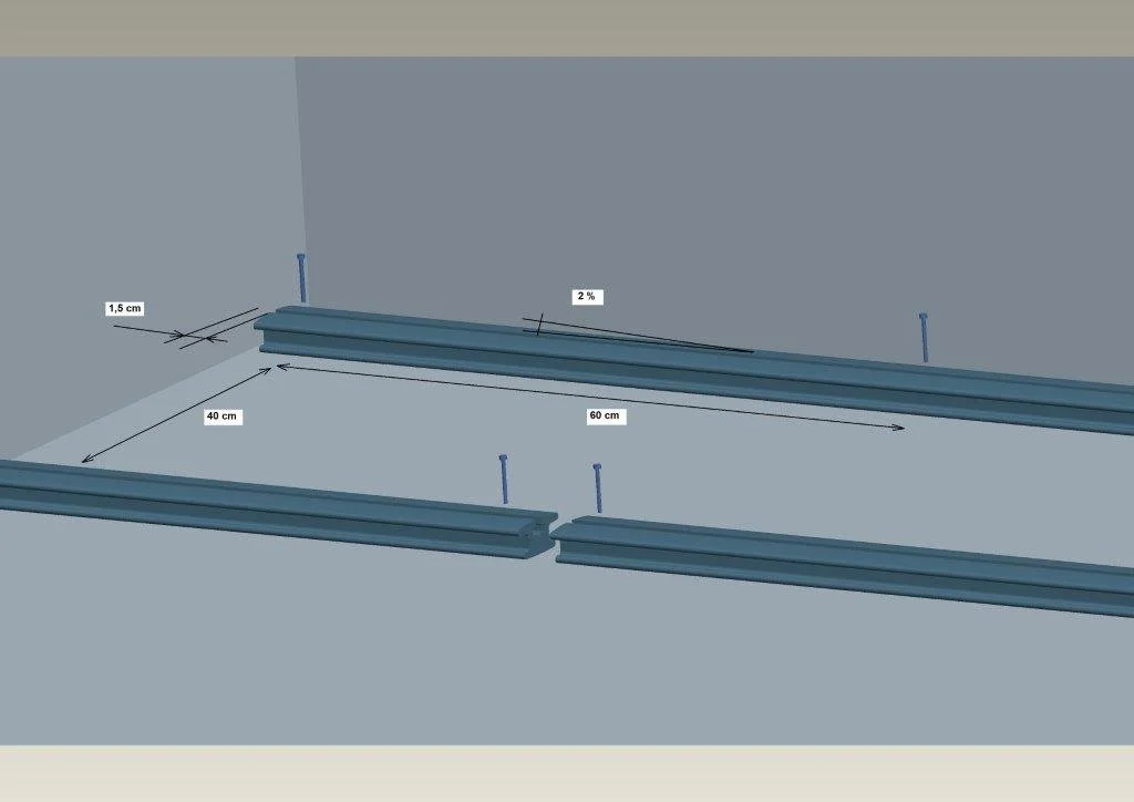 Pe terenul destinat amplasarii terasei se realizeaza o fundaţie din dale de beton (vezi img.1) sau se construieste o platformă betonată (vezi img.2). Panta recomandată, pentru fundatie, este de minimum 1% si maximum 2% inclinare in sensul de scurgere al apei. Construcţia inferioară (scheletul de montaj) se realizează astfel: se aşează şina de montaj pe fundatie conform şi se fixează cu holşuruburi la mijlocul dalelor. Distanţa dintre profilele de montaj este de 35-45 cm. Pentru terasele care sunt proiectate pentru trafic intens recomandăm ca distanţa dintre profile să fie de 30-35 cm.